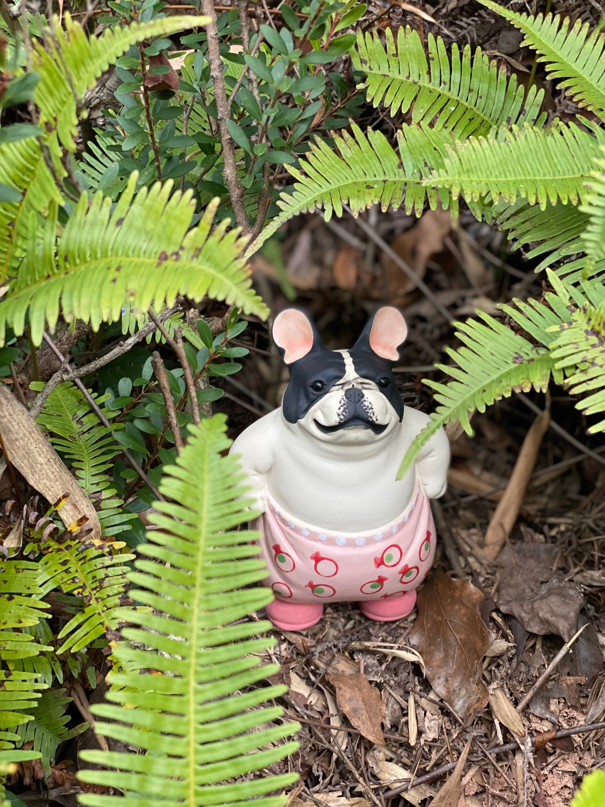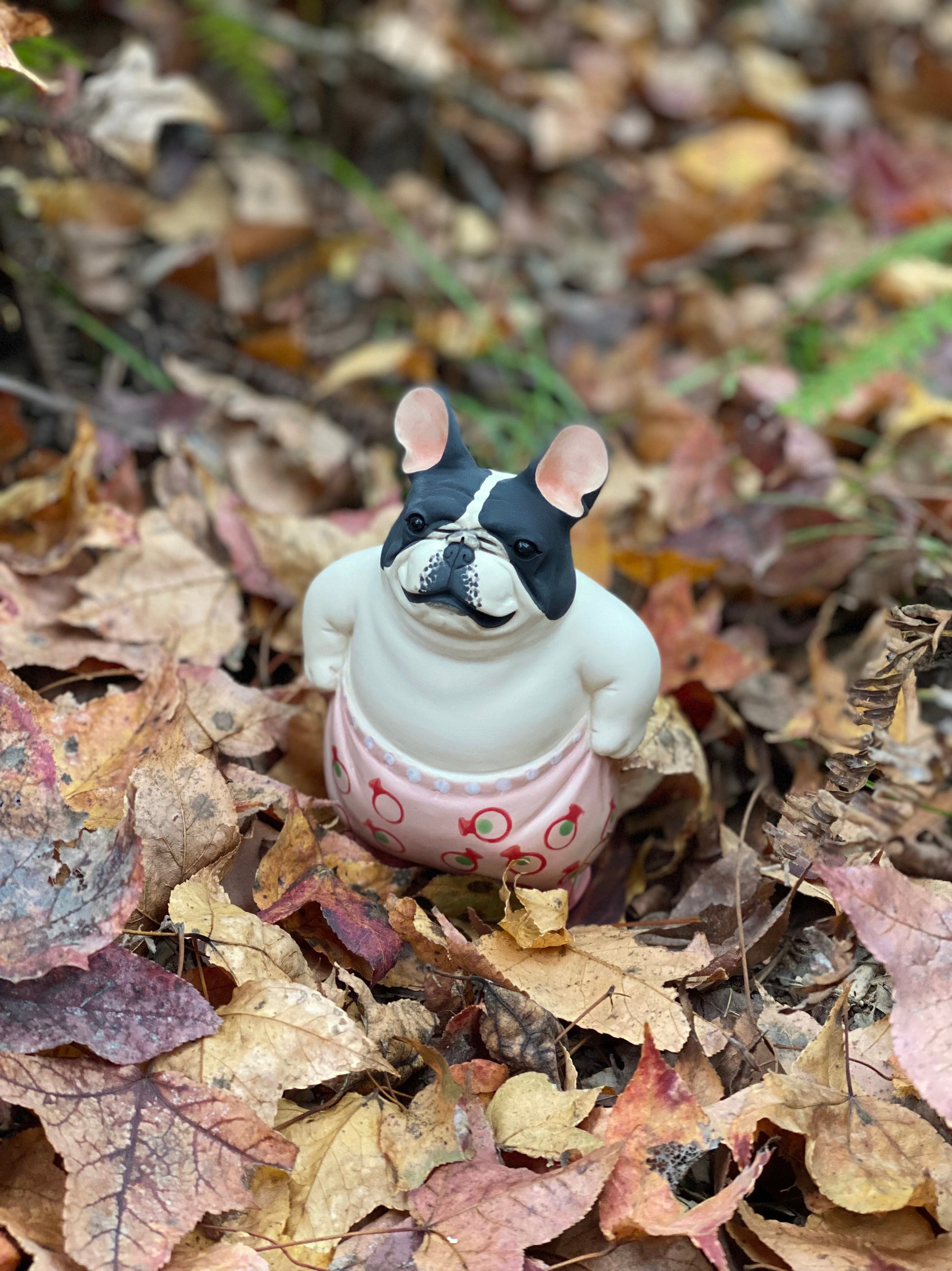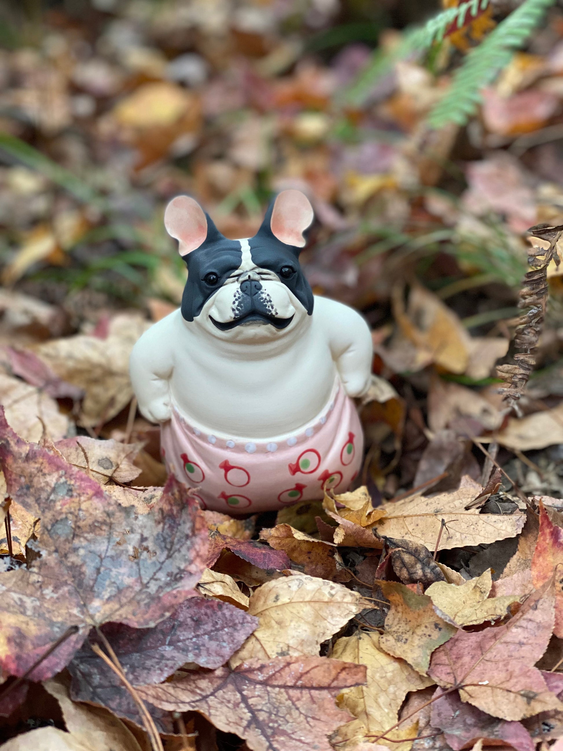 This charming figurine, "Pants-Up Pooch," combines playfulness and craftsmanship with a French Bulldog dressed in pants adorned with apple patterns, seemingly struggling to pull them up. Each piece is carefully handcrafted, with vivid details that highlight the unique artistry of ceramic work. Whether as a decorative item for your home or a personalized gift, this Bulldog figurine adds a touch of humor and warmth to any space, perfect for dog lovers and handmade art collectors.